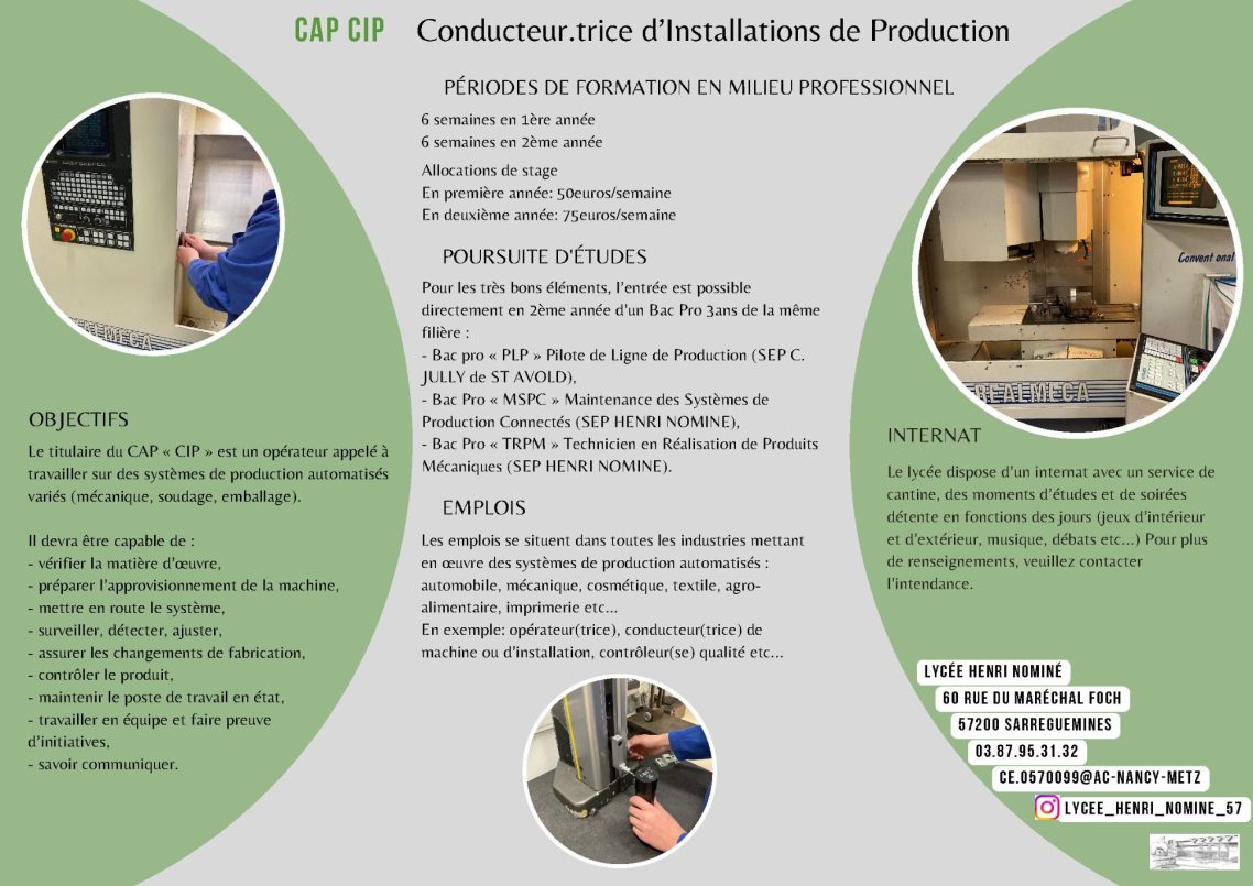 Le CAP Conducteur d'Installations de Production (CIP) est une formation professionnelle qui prépare les étudiants à gérer l'ensemble des processus de production dans différentes industries. À travers un programme varié alliant théorie et pratique, nos élèves sont formés aux techniques de conduite d'installations, tout en apprenant à garantir la qualité et la sécurité des productions.