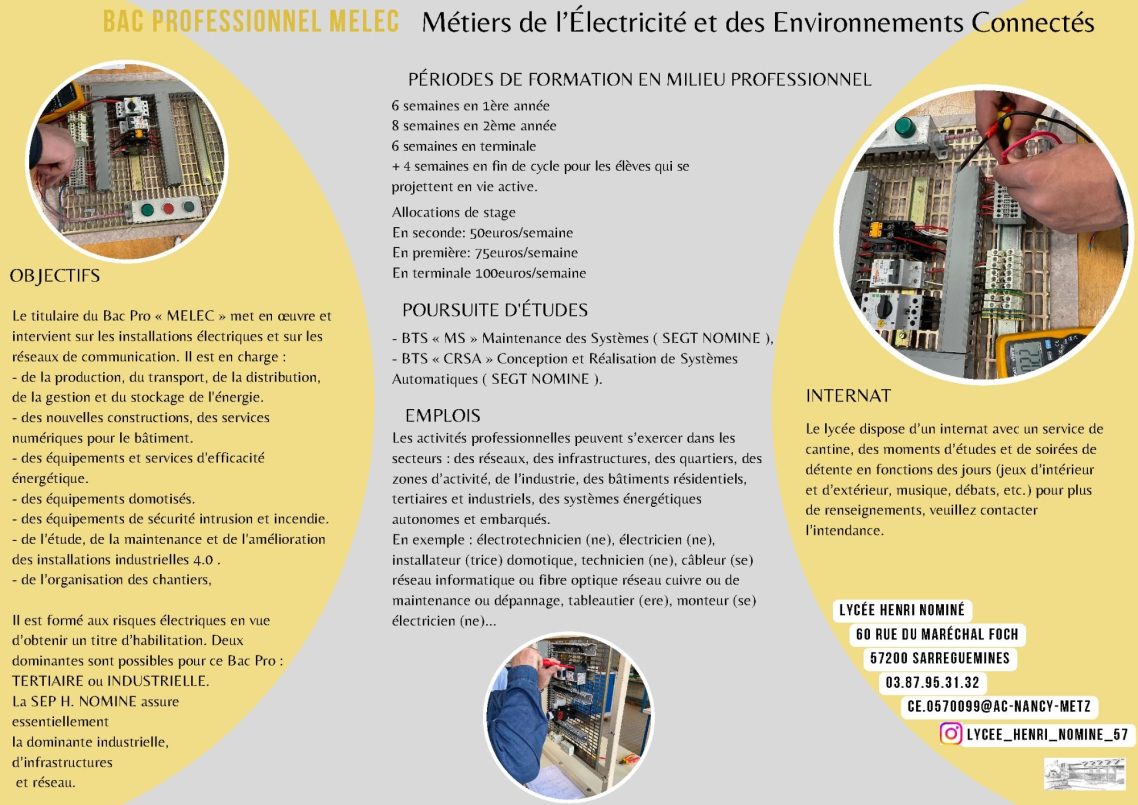 En intégrant le BAC PRO MELEC au Lycée Henri Nominé, les étudiants s'engagent sur la voie d'une carrière prometteuse, en acquérant les savoirs et savoir-faire indispensables pour répondre aux exigences du marché du travail dans le domaine de l'électrotechnique et de l'énergie.